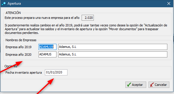 Después iremos a archivo / apertura de empresa año 2020 y aparecerá la siguiente ventana donde pulsamos en Aceptar.
