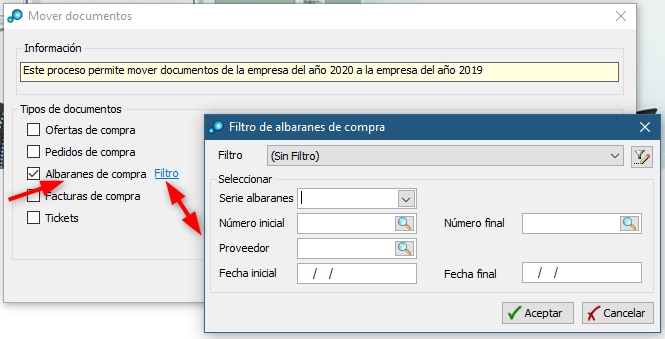 Una vez en esta pantalla se marca la opción que necesitamos pasar al año anterior y pulsando en filtro podremos seleccionar las opciones que ahí aparecen.